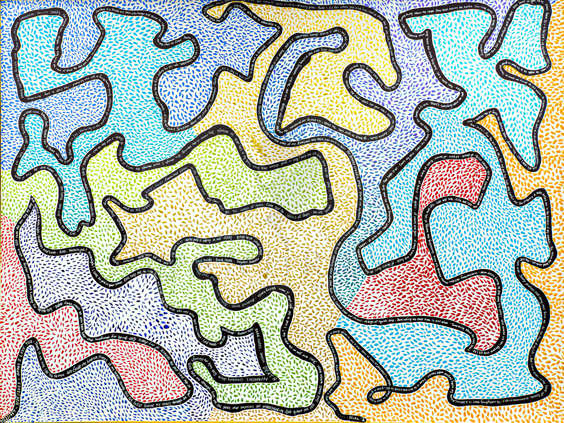 I created this piece after my father, Rodolfo E. Raymond passed away in 2023. It represents the waves and tears of fractured thoughts that often come with anticipatory grief.