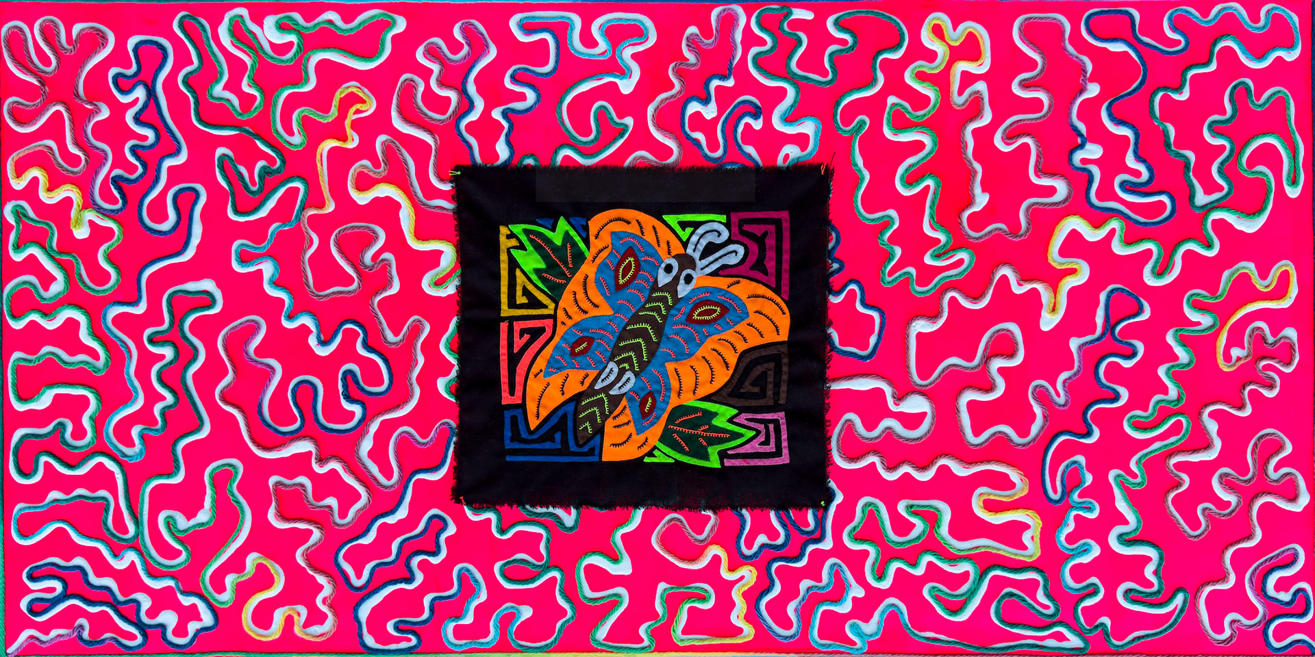 #mommorSussua - (Mixed-media painting incorporating an authentic hand-sewn Mola textile by a Kuna artist from Guna Yala. Painted elements and overall composition by Anji Ray.) #mommorSussua translates from the Kuna language into “butterfly - butterfly”. This authentic Mola panel comes from my father's land of Panama, where the indigenous women of the Guna Yala hand stitch each panel into their traditional daily wear using a reverse appliqué technique. Mola literally translates into the word “shirt” in Kuna. From it, I was able to create a piece of abstract work which highlights the beauty in the stitching.