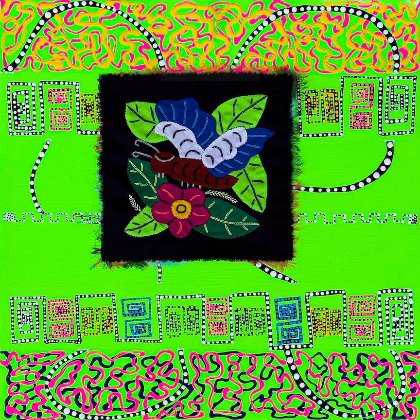 #mommorSussua3 - (Mixed-media painting incorporating an authentic hand-sewn Mola textile by a Kuna artist from Guna Yala. Painted elements and overall composition by Anji Ray.) #mommorSussua3 translates from the Kuna language into “butterfly - butterfly”. This authentic Mola panel comes from my father's land of Panama, where the indigenous women of the Guna Yala hand stitch each panel into their traditional daily wear using a reverse appliqué technique. Mola literally translates into the word “shirt” in Kuna. From it, I was able to create a piece of abstract work which highlights the beauty in the stitching.
