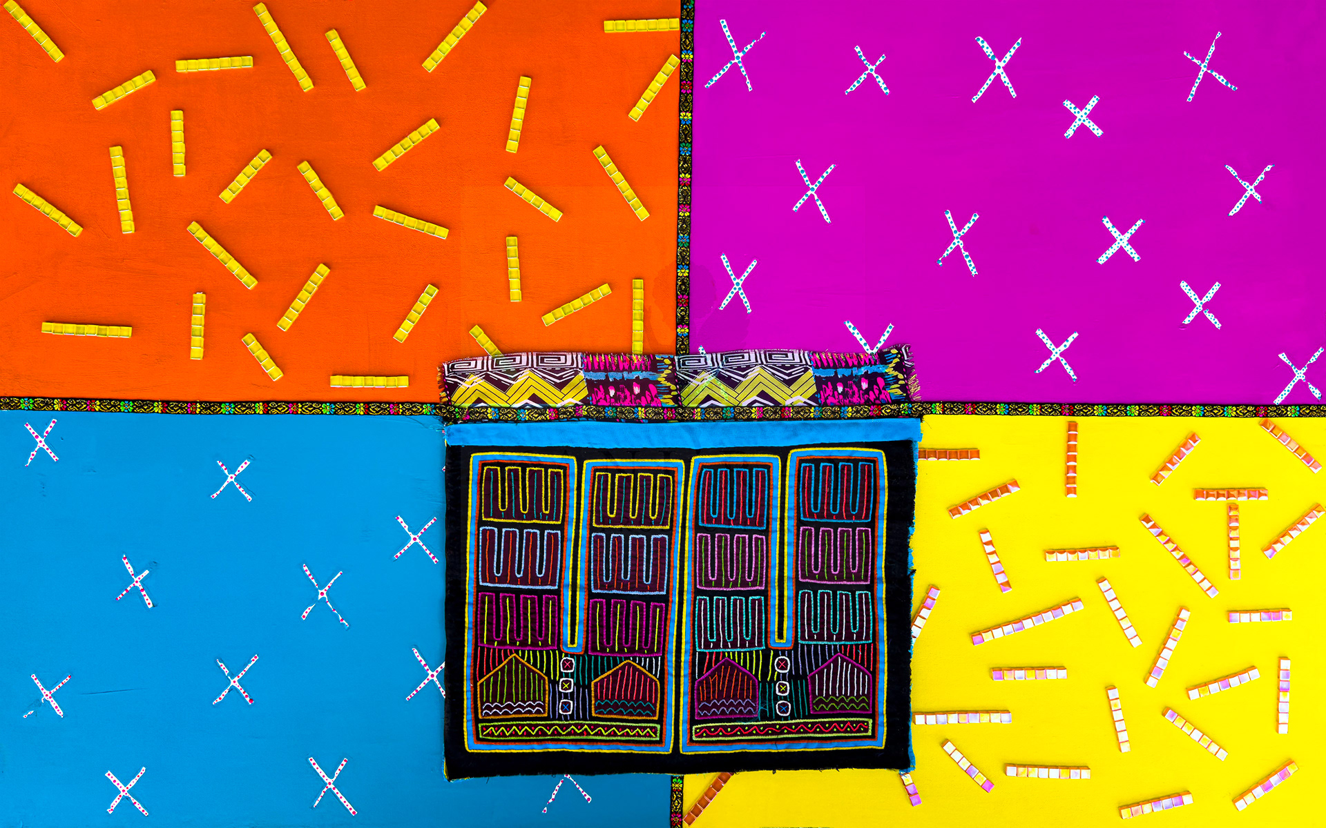 #negaTumat - (Mixed-media painting incorporating an authentic hand-sewn Mola textile by a Kuna artist from Guna Yala. Painted elements and overall composition by Anji Ray.) Nega Tumat translates from the Kuna language into “Casa Grande/Big House” This authentic Mola panel comes from my father's land of Panama, where the indigenous women of the Guna Yala hand stitch each panel into their traditional daily wear using a reverse appliqué technique. Mola literally translates into the word “shirt” in Kuna. From it, I was able to create a piece of abstract work which highlights the beauty in the stitching.